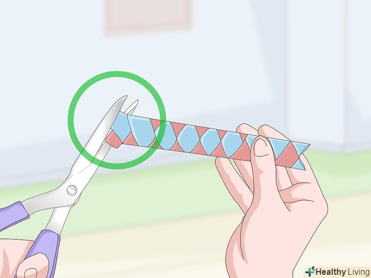 При необхідності обріжте папір. після того як ви склеїте пари смужок на початку, вони утворюють між собою прямі кути. Однак коли ви склеїте їх в кінці, Нижні смужки можуть виступати з-під верхніх. Обріжте зайвий папір ножицями, щоб знизу краю пастки були такими ж рівними, як зверху. [13]- Наприклад, якщо з-під жовтого паперу виступає помаранчева смужка, обріжте її так, щоб її краю збігалися з верхньою жовтою смужкою.