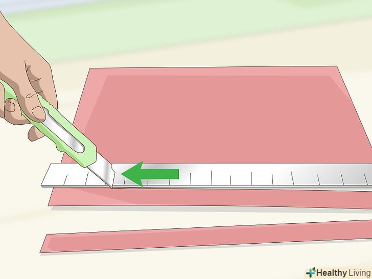 Виріжте з паперу дві смужки шириною півтора сантиметра. візьміть аркуш виробної або кольорового паперу для принтера довжиною 28-30 сантиметрів. Покладіть його довгою стороною до себе і за допомогою олівця і лінійки проведіть вертикальні лінії на відстані 1,5 сантиметра один від одного. Розріжте папір на смужки уздовж ліній за допомогою різака для паперу або ножа для виробних робіт і металевої лінійки. [1]- Можна порізати папір і ножицями, проте в цьому випадку краю можуть вийти нерівними.
