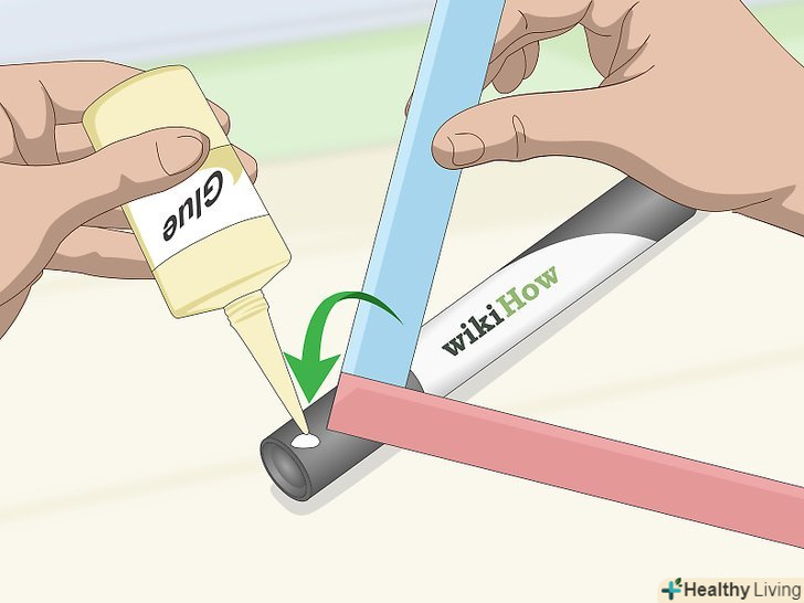 Приклейте пару смужок у формі літери «Г» до кінця маркера так, щоб вийшла фігура у вигляді стрілки. нанесіть поблизу кінця маркера краплю гарячого клею. Візьміть одну пару смужок і притисніть її кутом до клею. В результаті маркер з смужками повинен утворити фігуру у вигляді стрілки. [5]- Гарячий клей слід нанести на бічну сторону маркера біля його нижнього краю. Не наносите клей на самий кінчик маркера.
