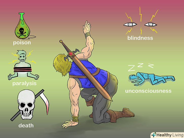 Підготуйте список статус-ефектів. Пригоди - справа небезпечна, знаєте! Ваш персонаж може захворіти або отримати каліцтво, яке зробить його, скажімо, менш моторним. Досить часто в рольових іграх зустрічаються такі статус-ефекти: отруєння, параліч, смерть, сліпота і втрата свідомості. [14]- Заклинання часто накладають на свої цілі статус-ефекти. Не завадить скласти список заклинань, які можуть впливати на фізичний стан персонажів.