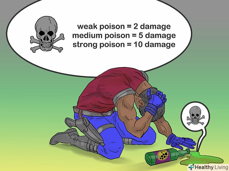 Якщо це доречно, визначитеся з втратою і тривалістю статус-ефектів. Далеко не всі статус-ефекти завдають шкоди. Крім того, більшість статус-ефектів з плином часу зникають самі по собі. Взяти наприклад параліч: припустимо, ефект паралічу може зникнути через 2 ходу, які персонажу доведеться пропустити без особливого (ну майже) для себе шкоди. У свою чергу, смертельна отрута може завдавати шкоди протягом декількох ходів. [15]- Для шкоди того чи іншого виду є сенс задати базові значення. Наприклад, слабка отрута може отруювати на 2 очки шкоди за хід, середній отрута — на 5 очок шкоди, а сильний — на всі 10.