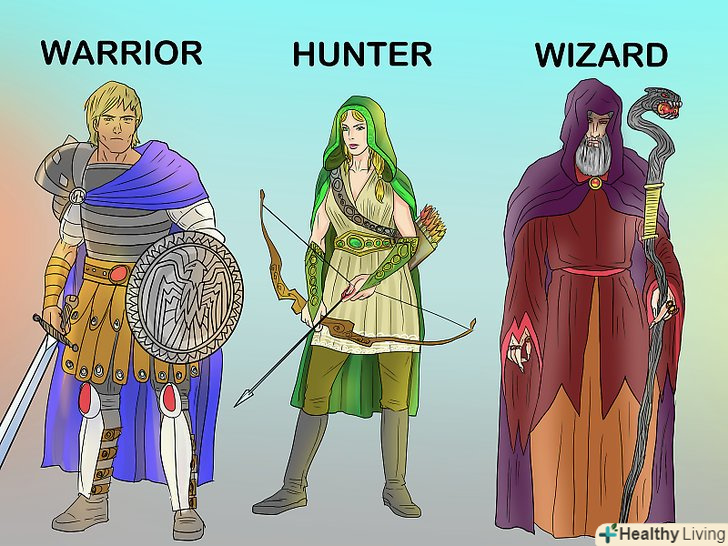 Придумайте можливі класи персонажів. класи-це щось на зразок професії, спеціальності персонажів вашої рольової гри. Серед найбільш поширених класів можна назвати воїнів, паладинів, злодіїв, шахраїв, мисливців, жерців, чарівників і так далі. Досить часто класи дають бонуси до дій, з ними пов'язаними. Наприклад, воїни отримують бонус до ухилення в битві. [7]- Зазвичай бонуси додаються до результату кидка кубика, що робить більш ймовірним успішне виконання дії. Якщо воїну потрібно викинути на 20-гранному кубику 10 або більше, то на профільну дію він може отримати бонус до кидка в розмірі, скажімо, 2 очок.