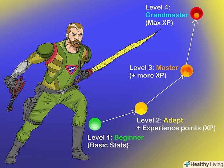 Продумайте схему розвитку персонажа. у багатьох рольових іграх розвиток персонажа залежить від одержуваного ним досвіду. Це означає, що за кожного переможеного ворога персонаж отримує спеціальні «окуляри досвіду». Коли гравець накопичить певну кількість досвіду, він отримує нові рівень, а разом з цим — додаткові очки. За рахунок цього забезпечується розвиток здібностей персонажа з плином часу. [8]- Також розвиток персонажа вашої рольової гри можна пов'язати з якимись особливими подіями. Наприклад, ви можете давати персонажам новий рівень і додаткові очки статов за перемоги в серйозних боях.