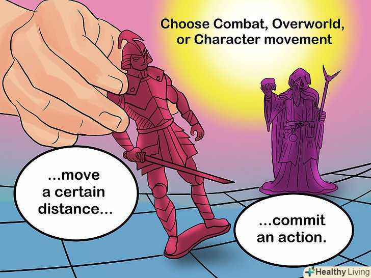 Вирішіть для себе, як буде відбуватися переміщення персонажів. власне, стояти на місці персонажам вашої рольової гри навряд чи вдасться, тому не можна скидати з рахунків питання переміщення. Багато ігор підходять до цього питання наступним чином: вони ділять переміщення на переміщення в бою і переміщення по місцевості. Власне, ви можете як використовувати такий підхід, так і придумати що-небудь своє. [10]- Як правило, в бою персонажі ходять по черзі, при цьому і гравці, і неіграбельні персонажі («неписи») отримують свій хід. У свій хід кожен персонаж може переміститися на певну дистанцію і виконати якусь дію. При цьому руху і дії зазвичай залежать від класу і раси персонажа, а також від ваги екіпіровки.