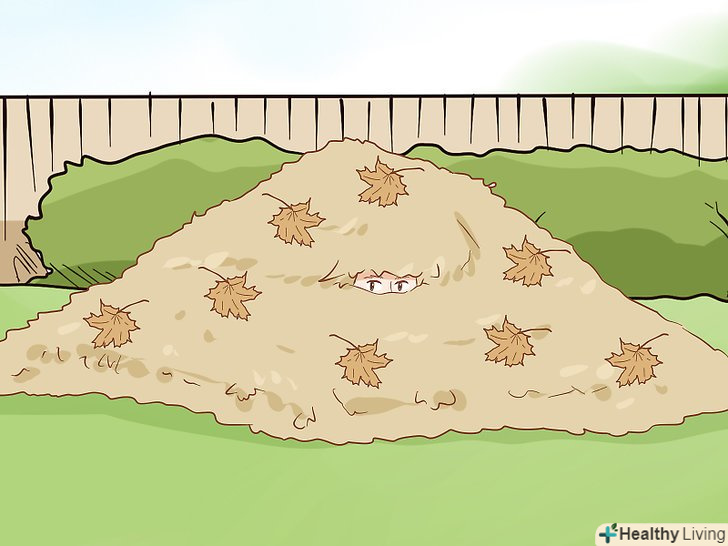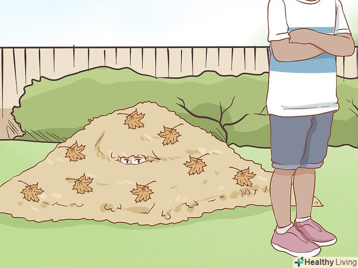 Заберіться в купу опалого листя і зачаїтеся. опале листя являють собою відмінний природний камуфляж. Пірніть в зібрану граблями купу і засипте себе листям, щоб повністю сховатися з виду. Ваші друзі ніколи не здогадаються, де ви ховаєтеся, якщо тільки ви не вирішите різко вистрибнути з купи, щоб шалено їх налякати! [12]- Перш ніж забиратися в купу листя, спочатку киньте туди камінь або палицю, щоб переконатися, що там не ховаються Дикі тварини.