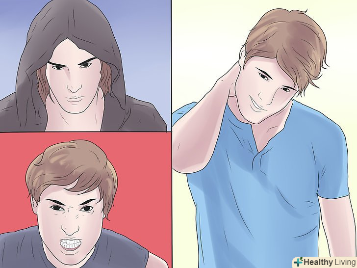 Практикуйте три різні погляди. перевертні можуть дивитися загрозливо і відверто моторошно, коли знаходяться напружені. Приміряйте на себе різні погляди, щоб довести втілення до бездоганності.- Один погляд для ворогів. Зробіть його глибоким і агресивним. Дивіться їм прямо в очі і спостерігайте за простором навколо них. Посміхайтеся з відкритим ротом. Коли вовки так роблять, це ознака виклику на поєдинок.