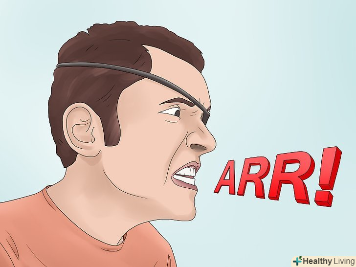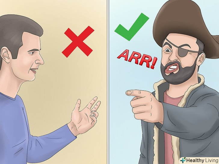 Додайте трохи хрипоти до вашого голосу. Пірати говорять низькими, похмурими голосами. Якщо у вас природний високий голос, тренуйтеся говорити басом . Частіше кричіть, щоб напружити голосові зв'язки, так ви зможете досягти більш хрипкого голосу. Також можна пополоскати горло лимонним соком, щоб додати більше шорсткості до голосу. [8]- Ви можете пошкодити голосові зв'язки, якщо не будете обережні. Випийте заспокійливого трав'яного чаю в кінці дня, щоб розслабити голосові зв'язки, і дбайте про себе, якщо ви втратили голос. [9]