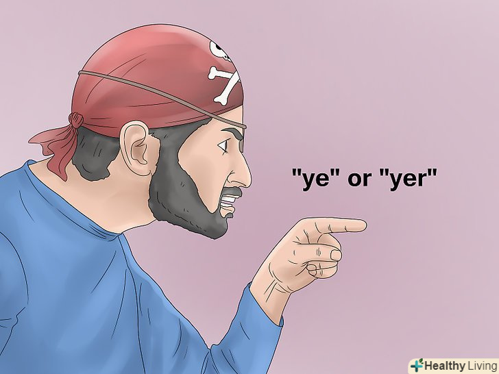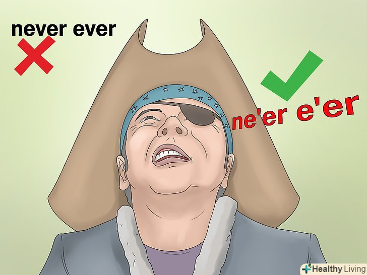 Нечітко бурмочіть слова. пірати не стільки формулювали свої фрази, скільки безглуздо бурмотіли (частково через рому, який вони пили). Згадайте про популярних піратських персонажів, таких як капітан Джек Горобець: зазвичай він так говорить, ніби він сильно п'яний. Спробуйте незв'язно бурмотіти при розмові з людьми, а якщо вони попросять роз'яснень, говорите ще більш нескладно.- Вставляйте Г і в в слова. Замість "ніколи-ніколи "скажіть" Ні'огда-ні'огда."Замість " сміятися" і "купатися" можна говорити "сміяця"і " купаЦА".