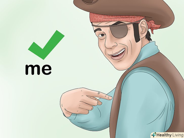 Говоріть про себе "мені", а не "я". пірати не говорять" я " або "Мій", вони завжди говорять про себе "мені", навіть якщо це буде не зовсім правильно граматично. Замість того, щоб, наприклад, сказати: "я прохолов", пірат сказав би: "подарував мені випадок нежить!”- Пірати також не говорять "мій". Не кажіть: "подивися на мою карту". Замість цього скажіть: "Подивися мені на карту". Поміняйте "Мій"на " мені".