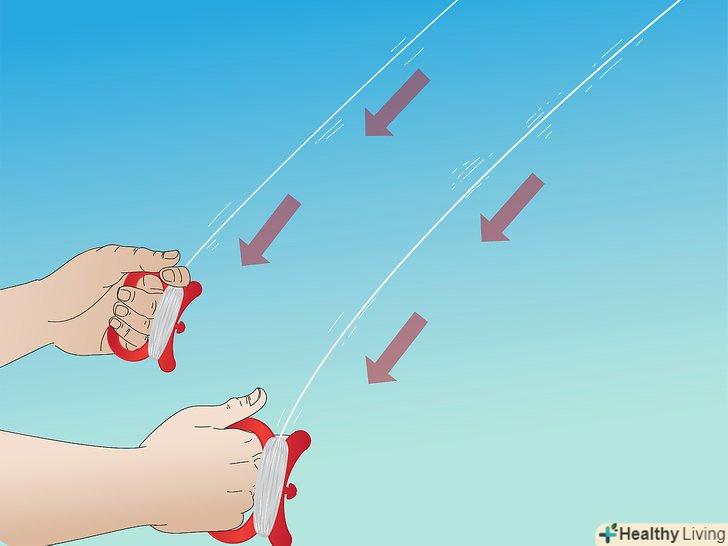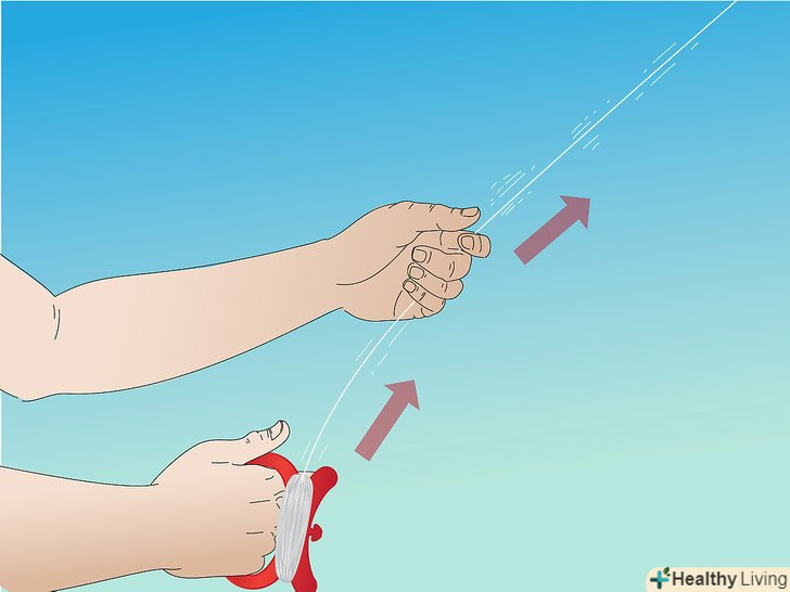 Трохи відпустіть нитку. як тільки змій зловить вітер, відпустіть вуздечку і почніть потроху відпускати нитку. Нитка не повинна провисати, вона повинна бути натягнутою, але при цьому досить податливою. Потягніть за нитку, щоб змусити змія злетіти вгору. Це допоможе йому піднятися вище в повітря. [11]