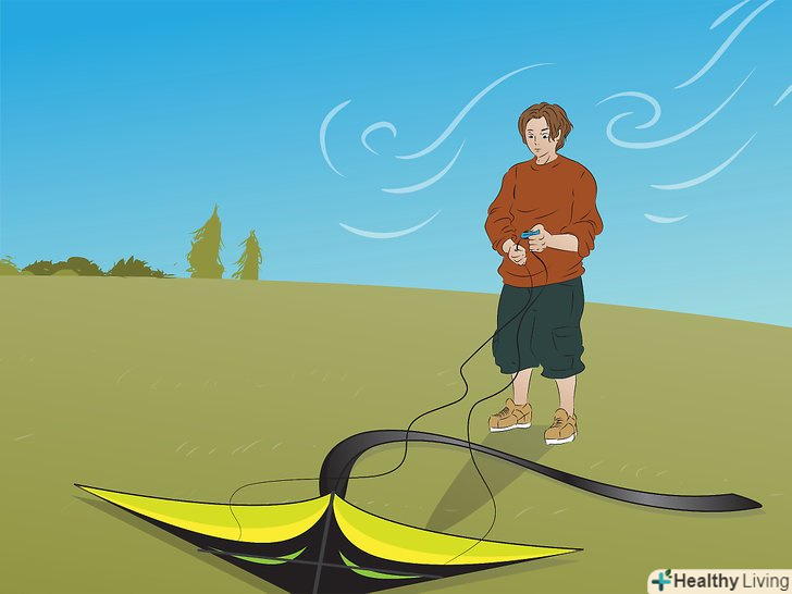 Встаньте спиною до вітру. покладіть змія на землю. Дно змія має бути звернено вгору. Дном є та частина змія, до якої прикріплені стропи. [16]- Як варіант, можна попросити друга потримати вашого змія на вазі.
