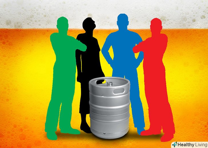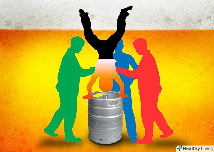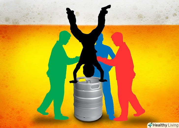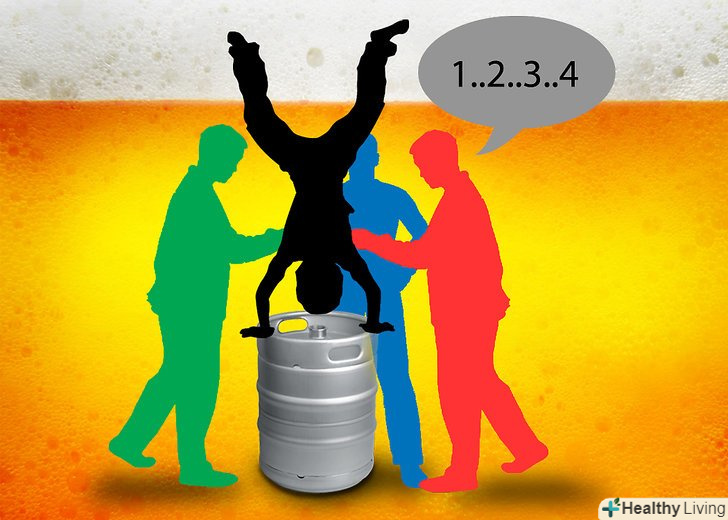 Поставте бочонок перед собою (дивіться, як буде легше піднятися з землі, можливо, спочатку на стілець або сміттєвий бак). поставте 2 друзів по праву і ліву сторону від того, хто буде пити, щоб вони дивилися один на одного. Оператор може займати будь-яке місце, краще навпроти питущого.