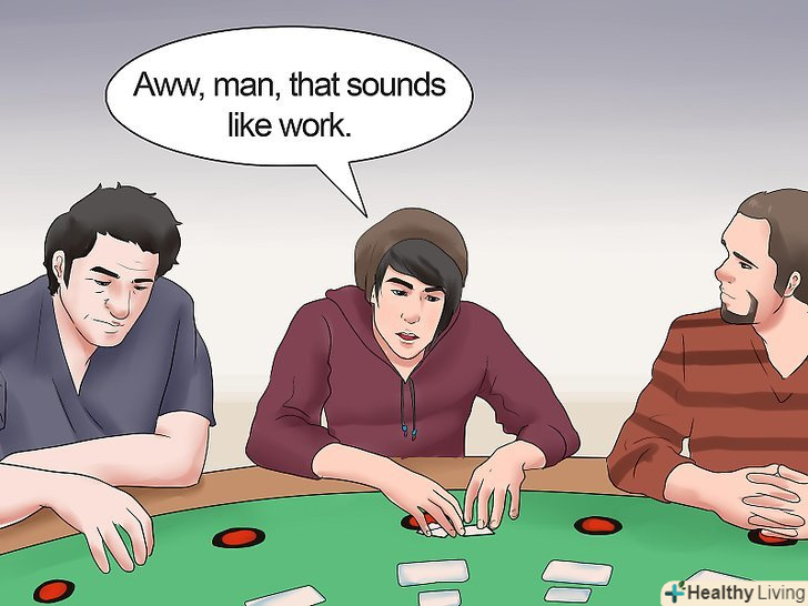 Знайдіть місце, де ви зможете постійно заробляти гроші. якщо ви станете професійним гравцем в покер, це не означає, що вам неодмінно потрібно поїхати в Лас-Вегас або почати брати участь в турнірах і світових чемпіонатах з покеру. Досить просто завжди вигравати у гравців у Вашому місті або навіть просто у вашому районі. Головне, у вас повинен бути постійне джерело доходів. Якщо ви знайдете гарне місце, де можна заробляти гроші, повертайтеся туди знову і знову.- Швидше за все, у вас швидко з'явиться репутація, особливо, якщо ви завжди будете грати в одному місці. Згодом люди просто не захочуть грати з вами, оскільки будуть знати, що ви неодмінно виграєте у них. Навіть може трапитися таке, що вони просто зрозуміють вашу стратегію і навчаться розпізнавати ваш блеф. Це-ще гірше.