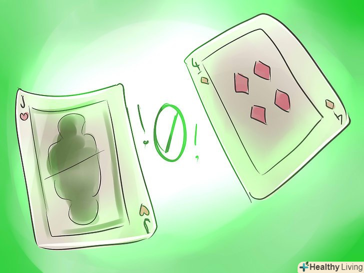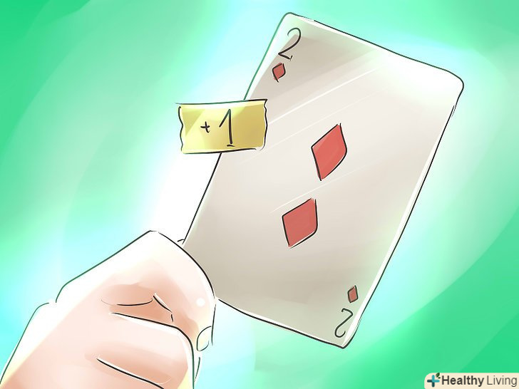 Вивчіть значення. щоб відстежувати співвідношення кількості високих карт до низьких (таким чином, знаючи колоду, використовувати інформацію в своїх інтересах чи ні), ви повинні будете призначити вашим картам вартість. Почніть з 0 і так далі для кожної карти, додаючи їх вартість в свій підрахунок.- Карти 2-6 мають значення 1.
