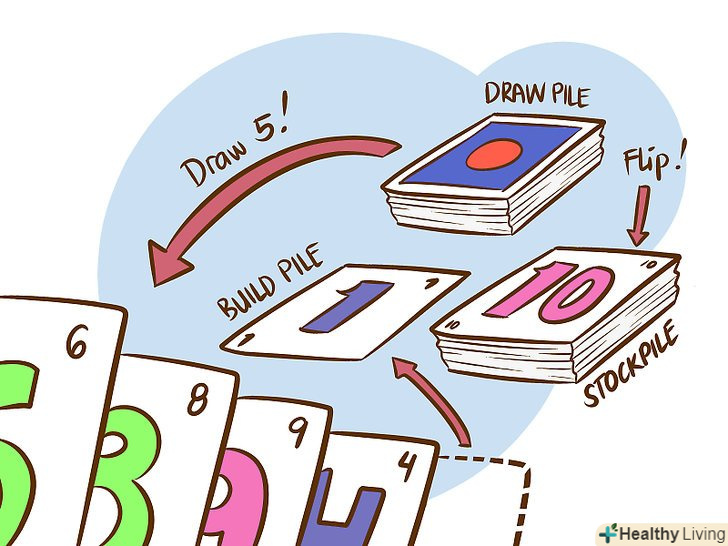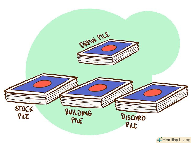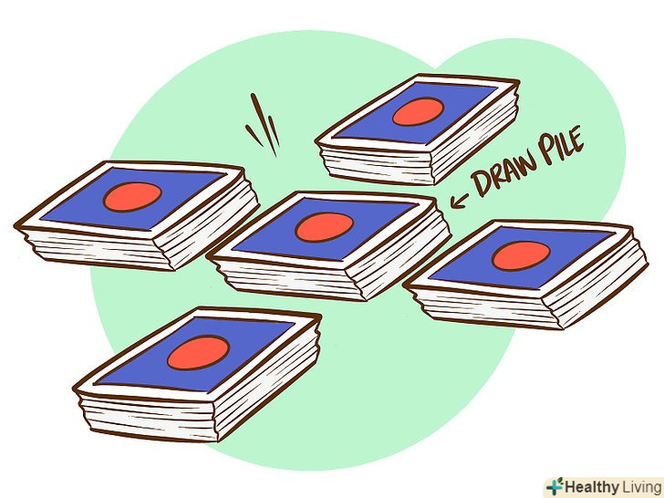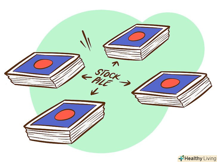 Знати як використовувати різні стопки. окремо від кожної стопки гравців, існує три інших типи стопок для різних цілей. Потрібно зрозуміти, як їх використовувати, перш ніж почати гру.- Після роздачі всіх карт, що залишилися карти кладуть на середину столу, де відбувається гра. Ця стопка називається магазином. Карти з цієї стопки витягуються спочатку кожної черги гравця і використовуються для створення стопки.