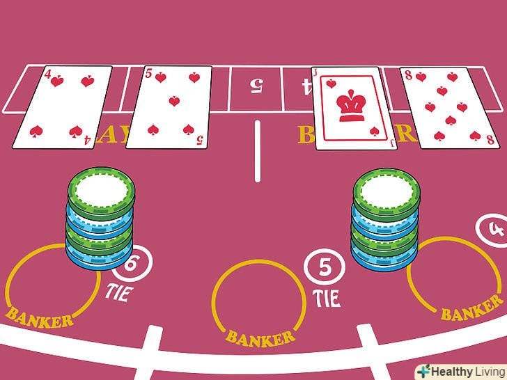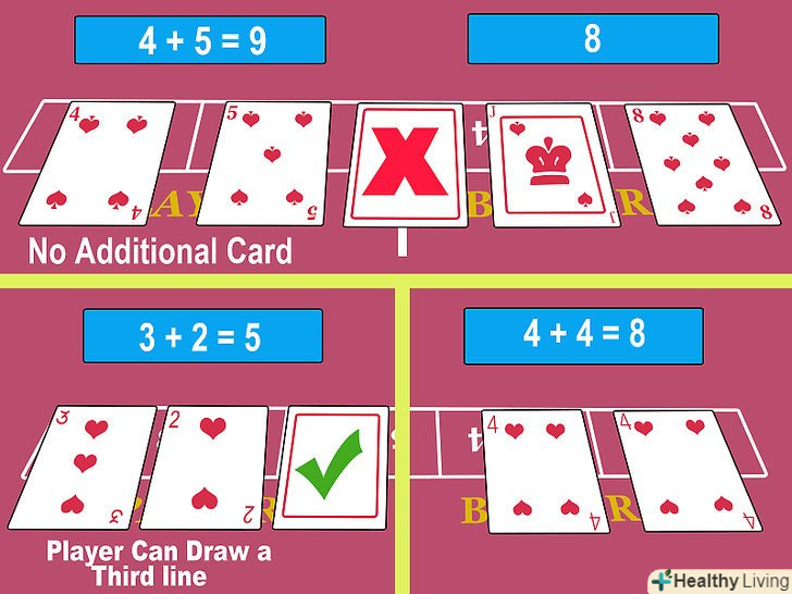 - Якщо третя карта гравця - 8, то банкіру лунає третя карта при 0-2 балах, і не лунає при 3-7.