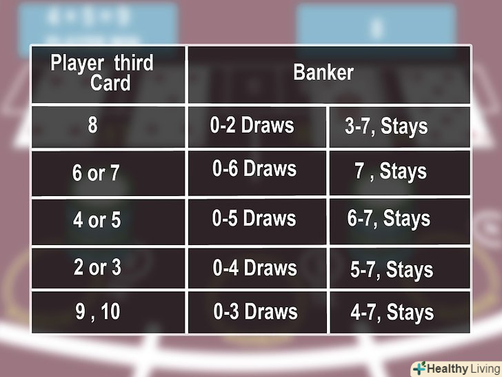 - Якщо третя карта гравця - 6 або 7, то банкіру лунає третя карта при 0-6 балах, і не лунає при 7.