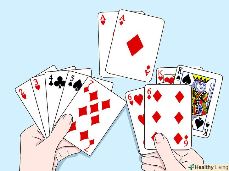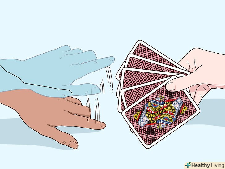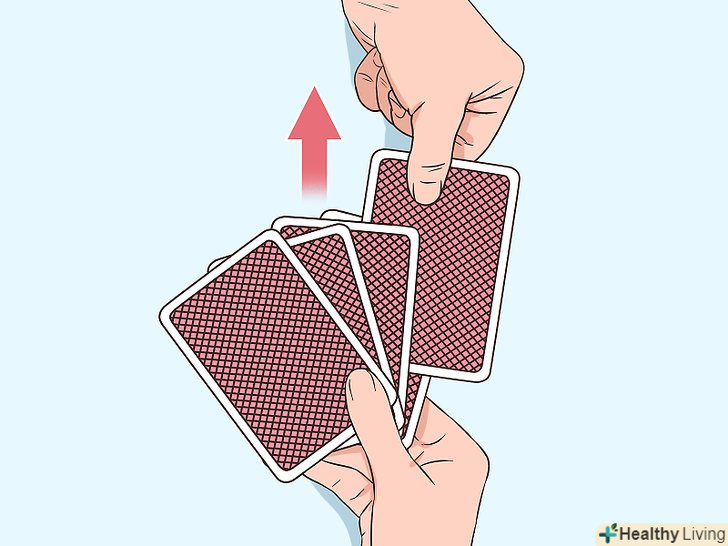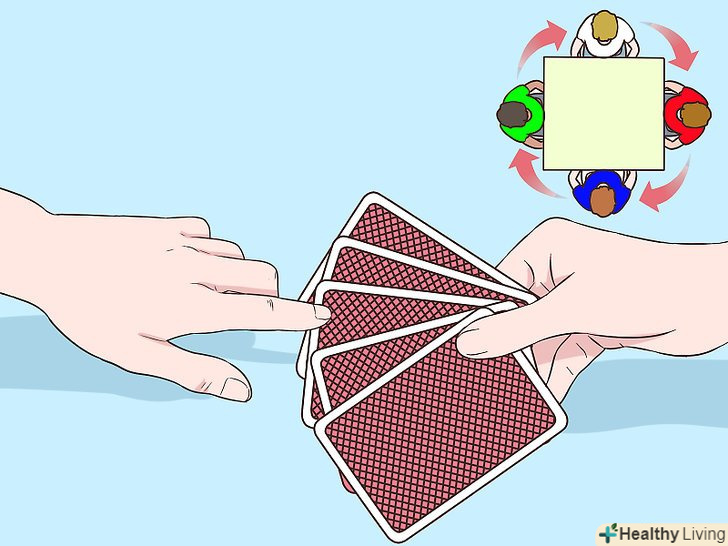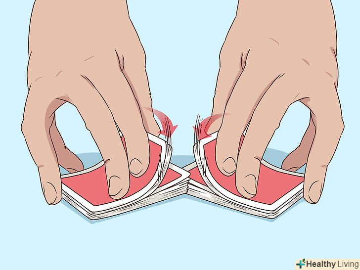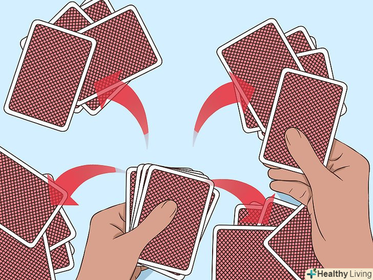 Перетасуйте карти. для початку виберіть здає, який буде тасувати і роздавати карти. Тасування карт необхідна, щоб карти йшли у випадковому порядку. Щоб перемішати карти, можна використовувати метод перегортання: розділіть колоду на дві частини і візьміть по одній в кожну руку таким чином, щоб вони дивилися один на одного. Потім за допомогою великих пальців перегорніть колоди один об одного так, щоб карти з кожної частини йшли поперемінно. [6]- Якщо вам складно тасувати карти методом перегортання, спробуйте просто перемішати їх! Покладіть карти на стіл і обертайте їх руками по колу близько хвилини.