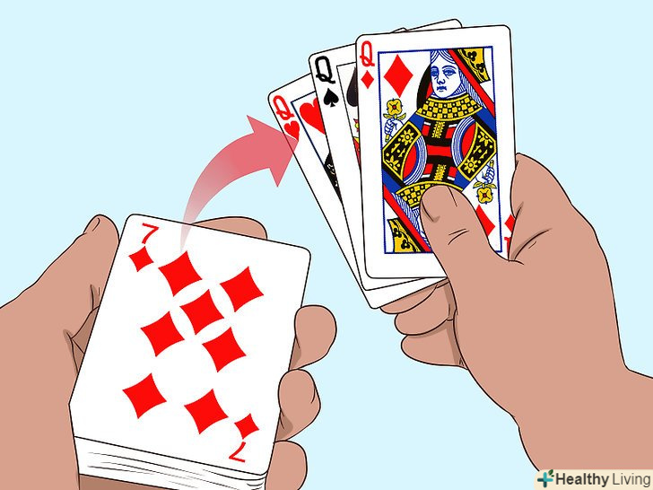 Відкладіть парні карти в руці. кожен гравець повинен подивитися на карти в своїй руці і знайти пари. Покладіть кожну пару горілиць перед собою. Якщо у вас є три однакові карти, викладіть дві, а третю залиште в руці. [8]- Якщо ви використовуєте стандартну колоду, зіставляйте карти за рангом. Це означає, що дві шістки утворюють пару, незалежно від кольору.
