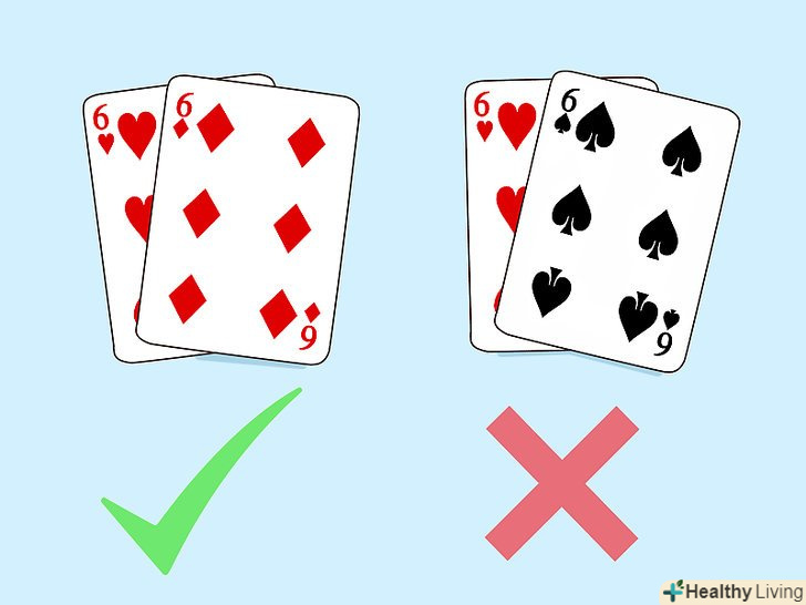 Щоб ускладнити гру, робіть пари з карт, що збігаються і за рангом, і за кольором. наприклад, шістка черв'яків і шістка бубон утворюють пару, тому що вони обидві червоні. При цьому шістка черв'яків не створить пару з шісткою пік, тому що шістка пік — чорна. [9]