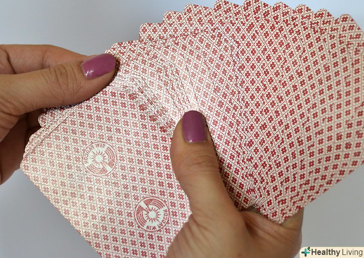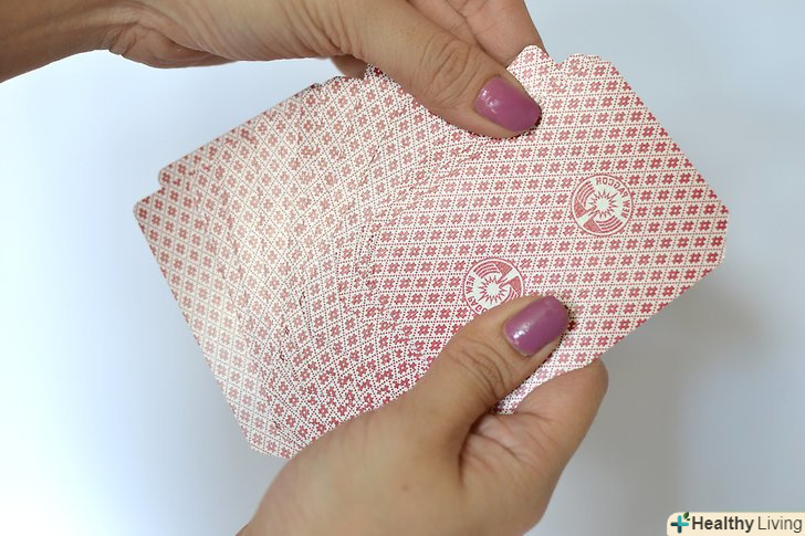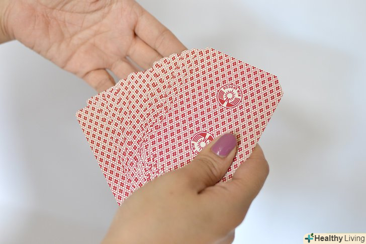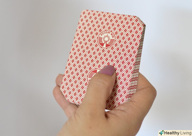 Тримайте колоду в правій руці. переконайтеся, що стопка чітко вирівняна і ніяка карт не визирає. Як тільки ви привели колоду в порядок, покладіть ліву руку зверху так, щоб тримати її обома руками.