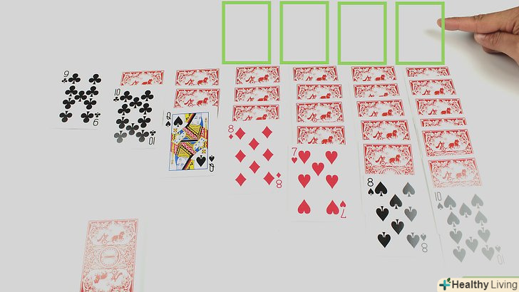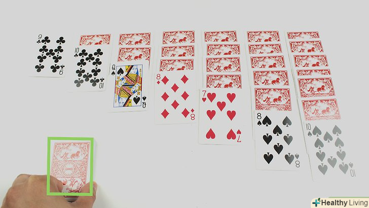 Зрозумійте суть гри. Вам потрібно створити чотири стопки карт-одну для кожної масті — за зростанням (починаючи з туза і закінчуючи королем).- Почніть з підготовки макета гри. покладіть одну карту горілиць і шість карт сорочкою вгору, поруч з першою. Далі, покладіть одну карту горілиць, поверх першої перевернутої карти, потім покладіть по одній перевернутій карті на кожну з п'яти вже перевернутих карт. Продовжуйте, поки на кожній стопці карт не буде по одній карті горілиць, і так, щоб на самій лівій стопці була одна карта, на стопці зліва від неї — дві, далі три, чотири, п'ять, шість, і, нарешті, на останній стопці має бути сім карт. [1]