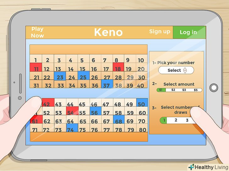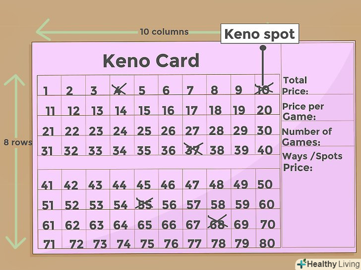 Виберіть номери і відзначте на карті кено або за допомогою працівника кено. кожен обраний номер називається Кено точкою, сама ж карта являє собою 8 рядів і 10 колонок цифр. На карті вказано, скільки номерів можна використовувати.- На деяких картах можна використовувати від 1 до 10 номерів, на інших - до 20. Ціна квитка не змінюється від кількості номерів на які ви ставите, так що ставте!
