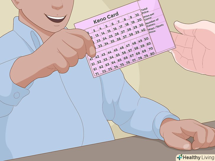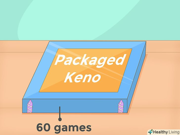 Придбайте карту кено. їх можна знайти в залах Кено в казино. Номери на картах (від 1 до 80) відповідають номерам на кулях у вентильованій Кено-машині.- В деяких місцях або в лотереях карти відрізняються. Деякі пропонують особливі бонусні або джек-пот карти, крім звичайних. Запитайте, чи пропонуються щось додатково.