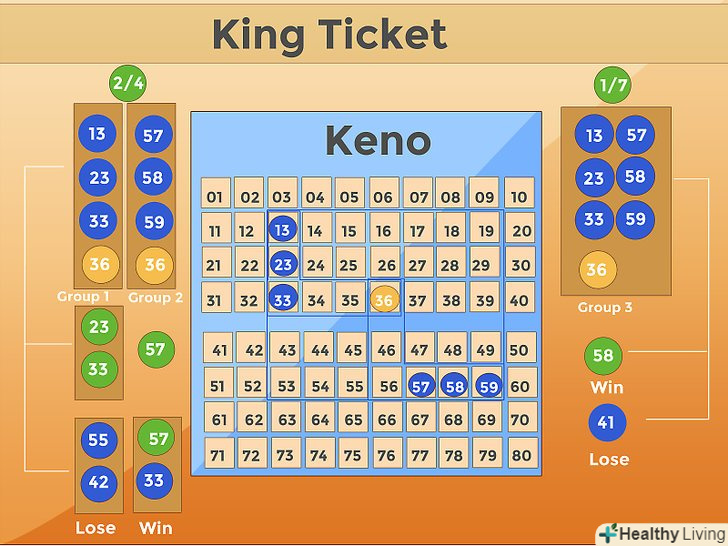 Зіграйте" Королівський " квиток. якщо гуртком обведений один номер, це "король". Його також можна включити в комбінації. Давайте повернемося до першого прикладу (2/3 і 1/6) - додамо до комбінацій короля і отримаємо 2/4 і 2/7. До кожної групи з трьох приєднаний король і доданий до суми, він дорівнює семи номерам.