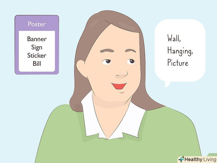 Використовуйте синоніми та антоніми. якщо вам вдасться навести людей на думки про слова, схожих на те, що ви описуєте, у вас вийде направити їх в потрібний напрямок. Пам'ятайте: не можна говорити "звучить як" або» римується з", тому не намагайтеся використовувати ці слова в своїх підказках.- Наприклад, якщо загадане слово — «плакат», можна описати його як настінну вивіску або картину.