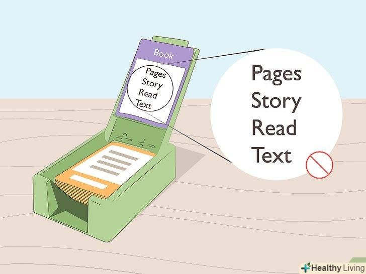 Уникайте заборонених слів. кожна карта включає в себе кілька найбільш очевидних, пов'язаних з нею слів і позначає їх як заборонені слова, які не можна називати. У випадку зі словом «книга» забороненими словами можуть бути «сторінка», «читати», «розповідь», «м'яка обкладинка» і «текст». Ви втратите очко, якщо скажете заборонене слово, тому важливо дотримуватися обережності. [3]- Не можна навіть вимовляти частину забороненого слова. Наприклад, якщо це» автомобіль«, то не можна говорити»авто".