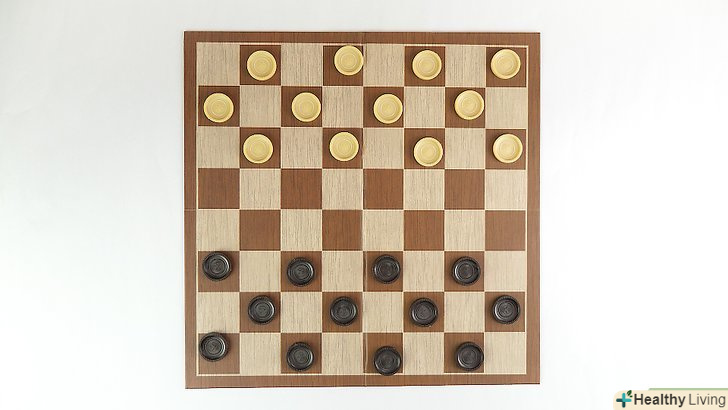 Розставте на дошці шашки. кожен гравець повинен розмістити свої шашки на 12 чорних клітинах, розташованих в перших трьох ближніх до нього горизонтальних рядах. Таким чином, в кожному ряду має розміститися по 4 шашки. Пам'ятайте про те, що шашки ходять по діагоналі, переміщаючись тільки по чорним клітинам. [3]- Оскільки дошка складається з 8 рядів, 6 з них будуть зайняті шашками гравців, і два центральних ряди залишаться вільними.