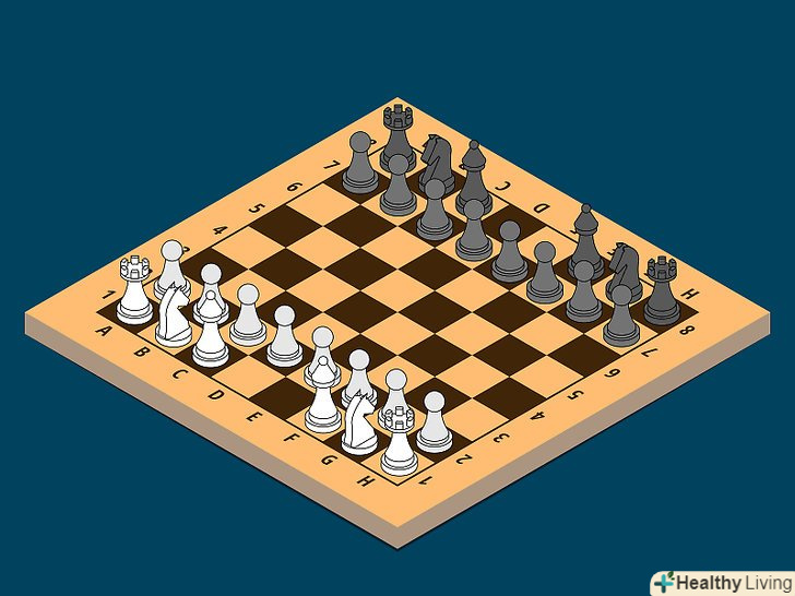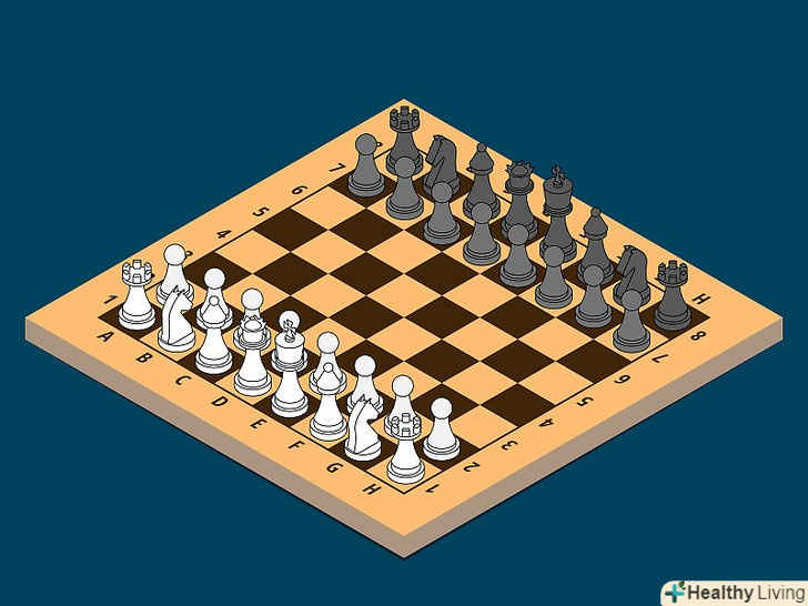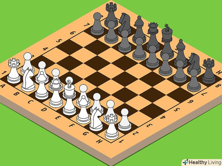 Познайомте дитину з шахівницею. дошка має 8 горизонтальних і 8 вертикальних ліній. Всього вона складається з 64 клітин. Половина клітин пофарбовані в світлий, а половина — в темний колір. Якщо у вас немає під рукою шахової дошки, її можна намалювати на аркуші картону або шкільній дошці.- Якщо ви малюєте шахову дошку самі, пронумеруйте горизонтальні ряди від 1 до 8, а вертикальні — буквами латинського алфавіту від «a» до «h». В цьому випадку при подальшому навчанні ви зможете використовувати координатну систему. [1]