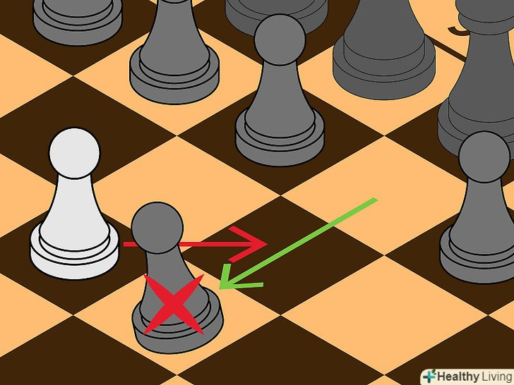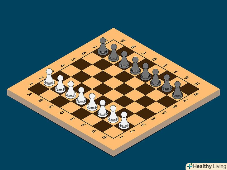 Пограйте одними пішаками. розставте на шахівниці лише пішаки. Мета даної гри полягає в тому, щоб перевести на протилежний край дошки якомога більше своїх пішаків. Якщо два пішаки впираються один в одного і не можуть ходити далі, вони зупиняються. Нагадайте дитині, що пішак ходить на одну клітку вперед, поки не стикається з пішаком противника. Пішак може побити пішака суперника, якщо та розташована попереду від неї на сусідній клітці по діагоналі. [4]- Інша мета даної гри може полягати в тому, щоб першим довести свою пішака до протилежного боку дошки.