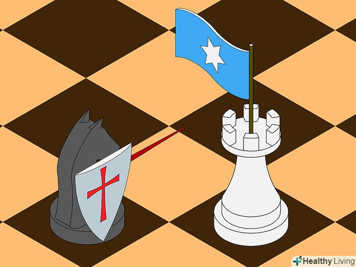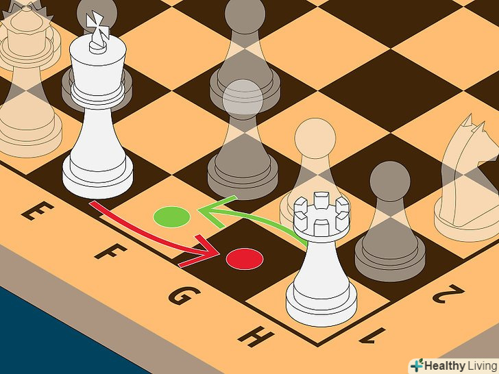 Введіть тури. розставте на дошці тури, слонів і пішаки. Мета як і раніше полягає в тому, щоб довести пішака до протилежного краю дошки. Нагадайте дитині про те, що тура може ходити на будь-яку кількість клітин по горизонталі або вертикалі, але при цьому їй не можна перестрибувати через інші фігури. [7]- Дитина повинна засвоїти, як важливо зберегти тури до кінця гри.