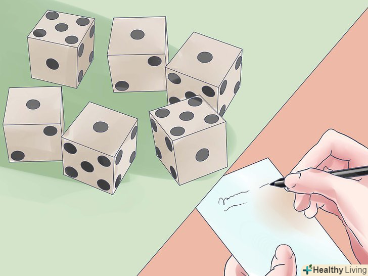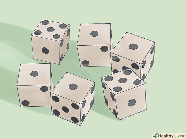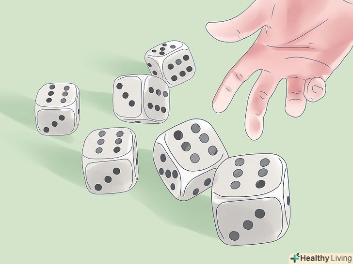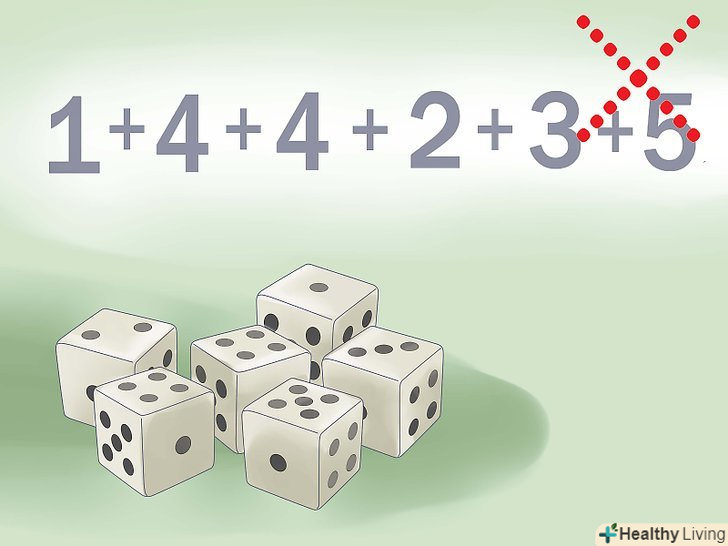 "заблокуйте" будь-які випали кістки, з які ви захочете скласти виграшну комбінацію. після того як ви перший раз кинете 6 кубиків, то далі, якщо побажаєте, можете кидати меншу кількість кубиків. Коли ви вирішите припинити кидати кістки, запишете свої окуляри, які ви набрали під час ваших ходів, в таблицю результатів.- Примітка: будь-які кістки, які ви відклали, не можуть бути використані для поєднання з кинутими кубиками після цього, тобто, відклавши в сторону дві "5", а потім у вас випаде знову "5" Ви отримаєте 150 балів замість 500.