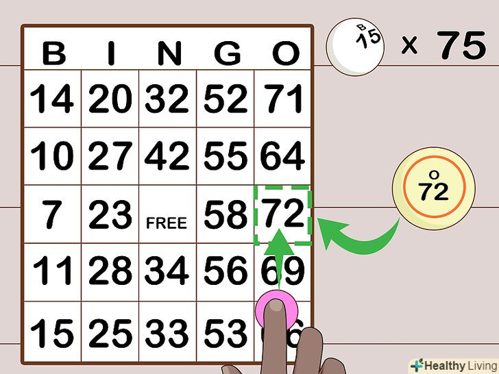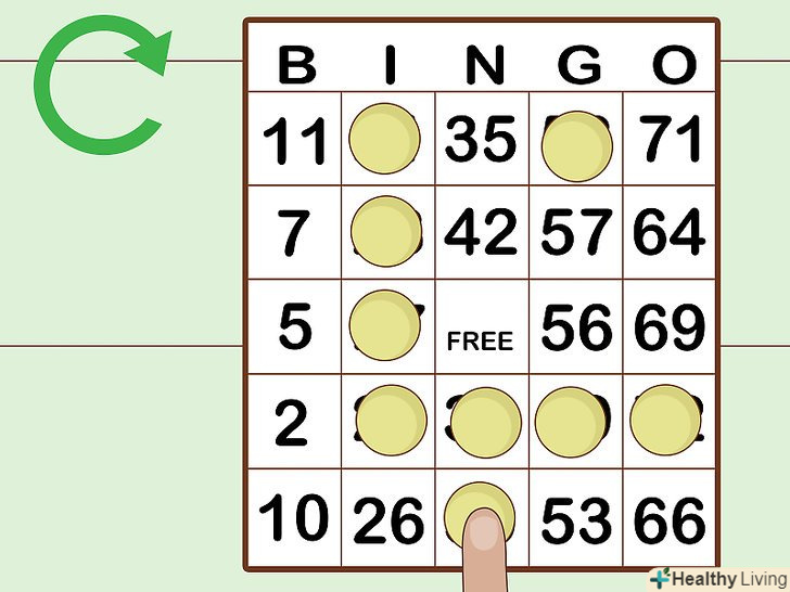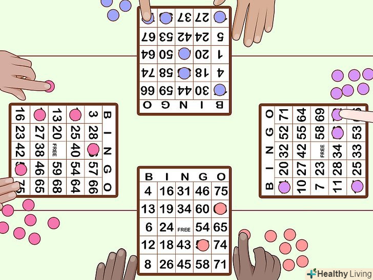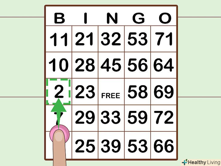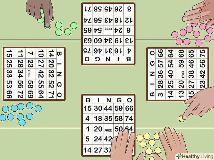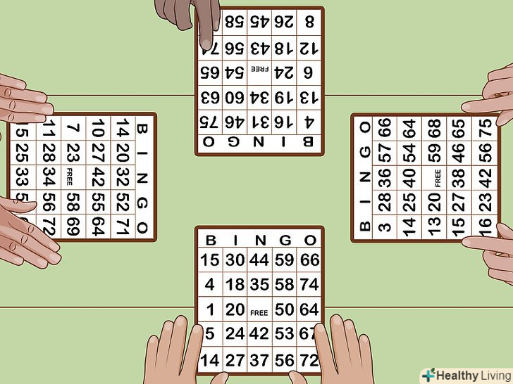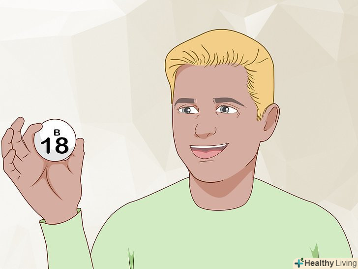 Кожен гравець отримує як мінімум одну ігрову картку. картки складаються з 25 клітин з випадковими числами, а верхній ряд займають букви зі слова "бінго". Ваша мета-накрити 5 клітин поспіль, щоб вийшов вертикальний, горизонтальний або діагональний ряд. [1]- Картки для бінго можна купити онлайн або в спеціалізованому магазині.