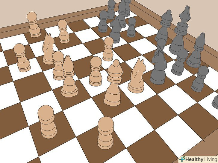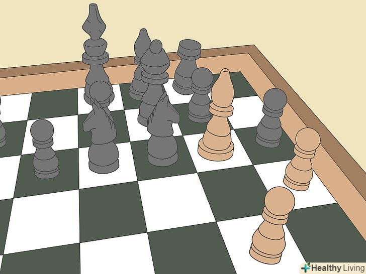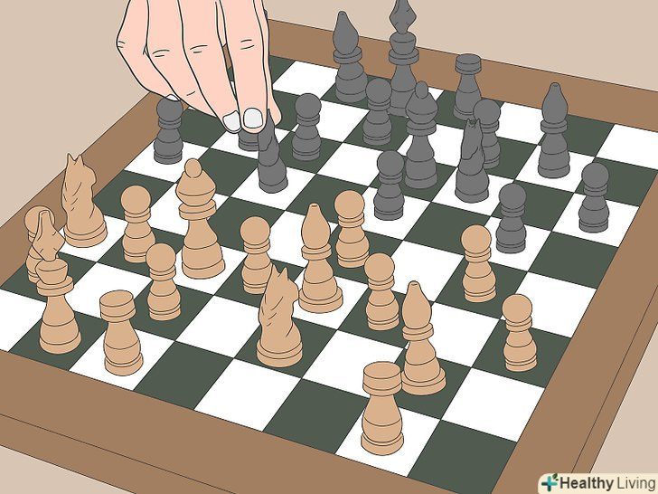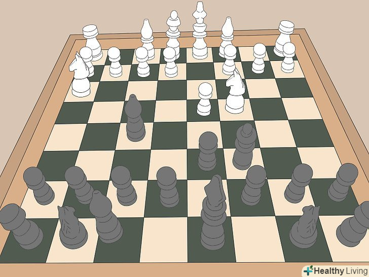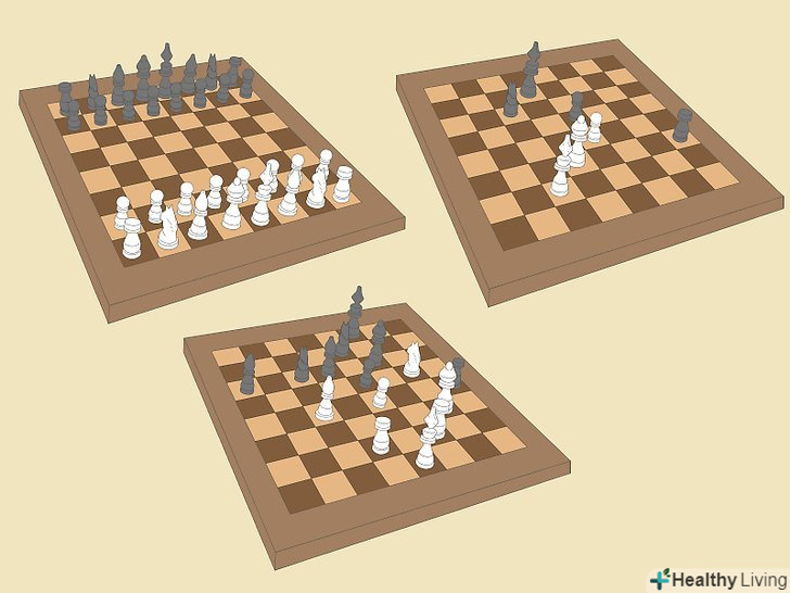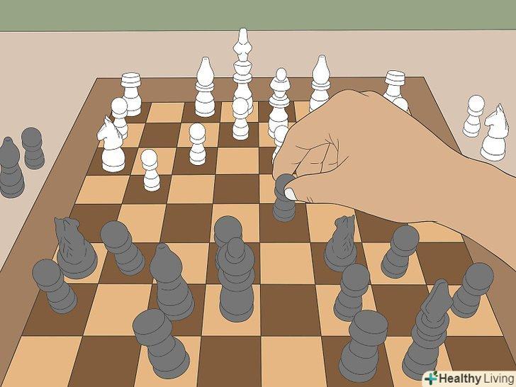 8. Позбавляйтеся від фігур противника єдиним фронтом. Вам потрібно зберігати контроль над центром, при цьому атакуючи, як єдине ціле. Ваші фігури немов деталі оркестру-всі вони служать унікальній меті, але найкраще працюють разом. Усуваючи фігури опонента, ви підвищите свої шанси обійти захист короля, а організувавши 2-3 групи підтримки, забезпечите матеріальну перевагу. [15]