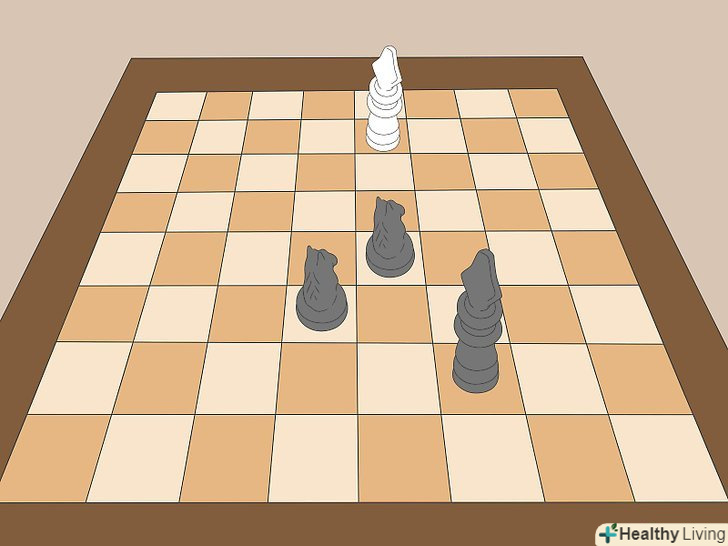 6. Навчіться робити вилку. Вилка, або подвійний удар — - це положення, при якому ваша фігура атакує дві або більше фігур суперника. [13] планування і реалізація вилки-відмінний спосіб отримати перевагу в матеріалі і забезпечити собі перевагу. Наприклад, якщо під ударом опиняться король і ферзь противника, у нього не буде вибору, окрім як віддати ферзя, даючи вам перевагу, якого зазвичай достатньо для виграшу партії. Намагаючись зробити вилку, майте на увазі наступне: