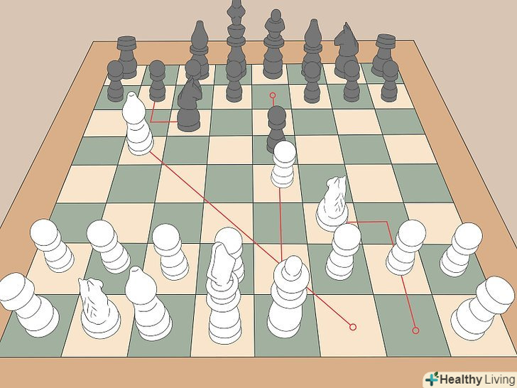 • Щоб взяти під контроль центр дошки, використовуйтеФерзевий гамбіт . Білі переміщують пішака на D4, тим самим витягаючи чорну пішака на D5. Після цього, білі, як правило, відповідають переміщенням пішака на C4. Цей маневр переносить протистояння на центр і відкриває дорогу для вашого ферзя і слона. [5]