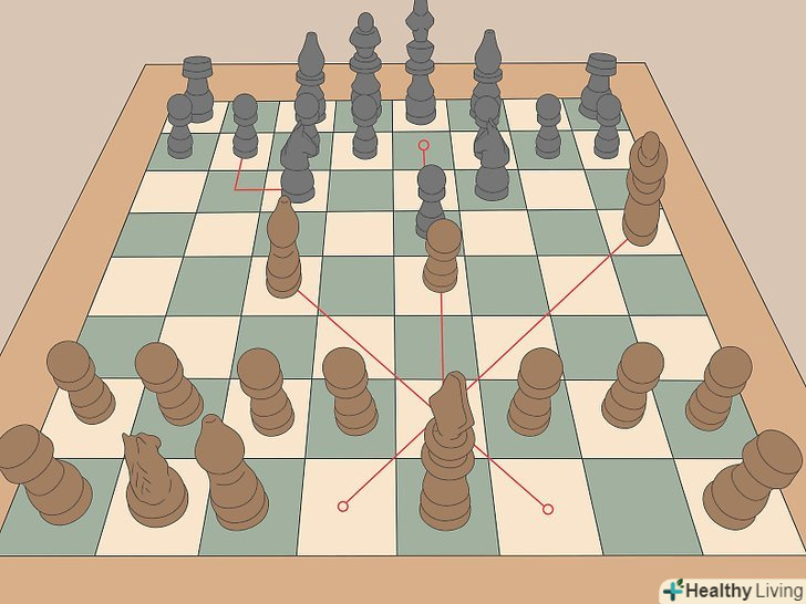 6. Розвивайте по одній фігурі за раз. Покінчивши з дебютом, переходите до розгортання бойових порядків. Ви повинні вивести всі свої фігури з початкових полів, переміщаючи їх на більш ефективні для них місця. [7]