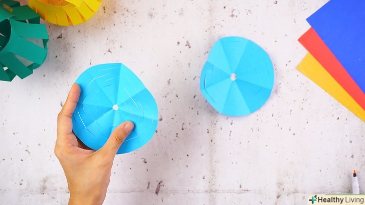Завершіть друге коло. повторіть 2-6 кроки з другим колом, в результаті чого у вас повинно вийти два однаково вирізаних гуртка.- Склейте кола разом. за допомогою клею з'єднайте два кола тільки по краях. Не склеюйте внутрішні частини кіл разом. Клей повинен просохнути.