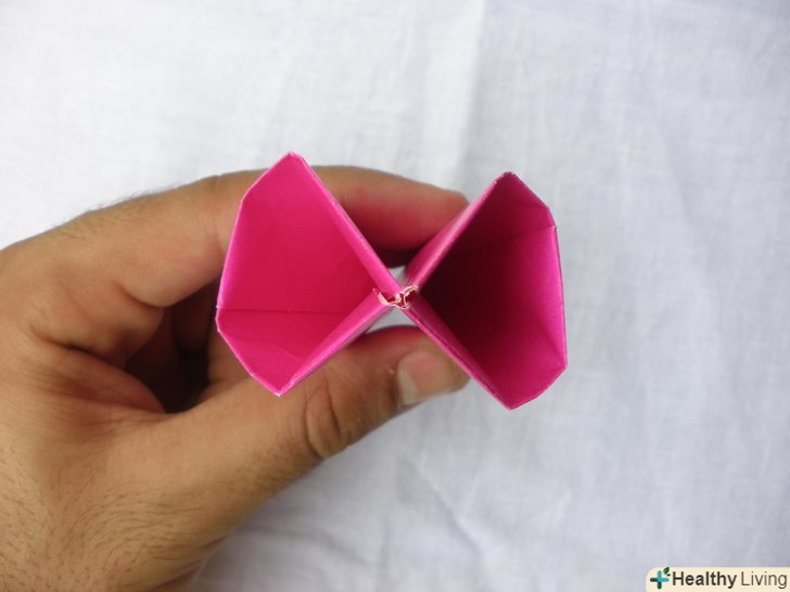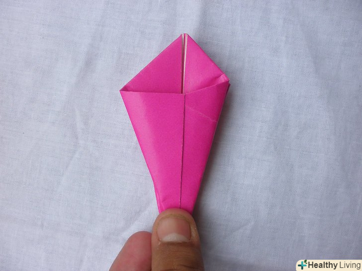 Загніть верхні шари з правого і з лівого боку ромба до центру, і вставте один шар в інший. (огляньте уважно край кожного шару, він повинен бути подвійним, завдяки чому утворюється отвір. Вставте кінчик однієї сторони в отвір іншої.) Притисніть і розрівняйте заготовку.