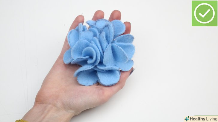 - Зберіть пелюстки. Приклейте кінчики кожної пелюстки на маленький вирізаний коло, який ви відрізали раніше. Плоскі сторони складених пелюсток нормально ляжуть один на одного, і у вас вийдуть красиві гортензії. Щоб закінчити, додайте трохи листя з повсті. [5]