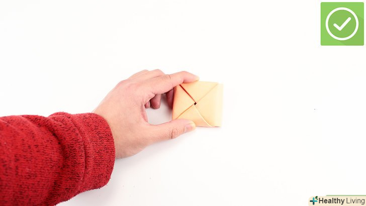 - Складіть кожен трикутник по діагоналі ще раз. на кожному кінці листочка повинно вийти по маленькому паралелограму. Акуратно складайте краю і зберігайте симетрію. Щоб перевірити, чи правильно ви склали, переверніть папірець на 90 градусів, тобто розташуйте її вертикально. Вона повинна нагадувати букву»S".