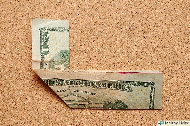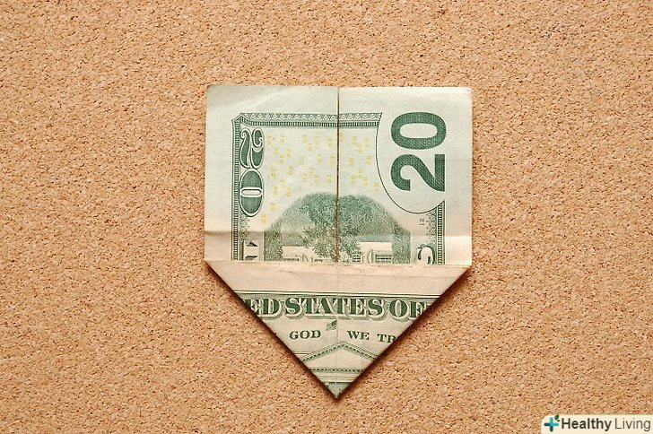 Загорніть лівий край банкноти під купюру і вгору. зробіть на лівому краї банкноти діагональний згин, що йде від центру Білого дому вліво під кутом в 45 градусів. Нижня ліва частина зворотного боку банкноти встане вертикально над верхнім краєм самої банкноти; переконайтеся в тому, що ви бачите на ній велику цифру "20" в кутку. [1]