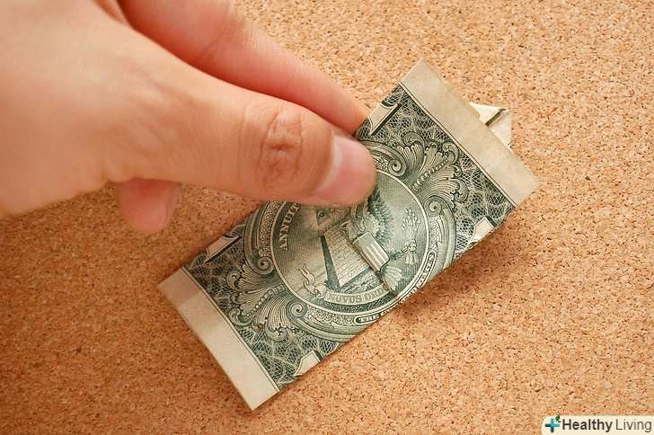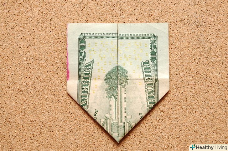Загорніть праву сторону банкноти точно так же, як і ліву. у складеному вигляді купюра буде виглядати як п'ятикутник, який стрілкою дивиться вниз. Фігуру складатимуть чіткий трикутник і два прямокутника, які виступають зверху через нього. Якщо придивитися до зображення над трикутником, можна розгледіти Палаючий Пентагон. [2]