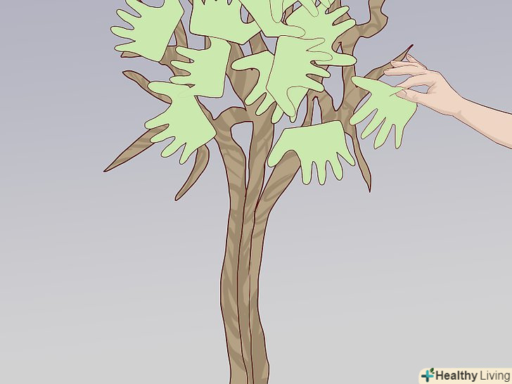 Додайте листя до вашого дерева. Приклейте листя до гілок або до стіни поруч з гілками. Попросіть дорослих допомогти вам з більш високими частинами вашого дерева.