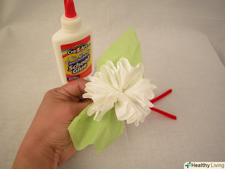 Складіть частину зеленого гофрованого паперу метеликом. Приклейте до задньої частини квітки, це будуть листя.