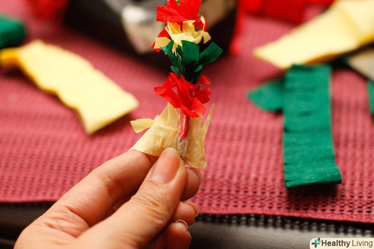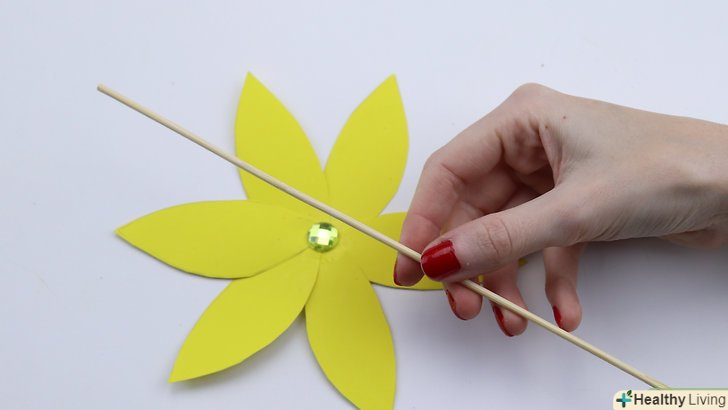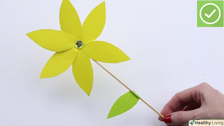 - З'єднайте стебло з пелюстками. щоб поєднати пелюстки і стебло ви можете взяти клей, скотч або навіть степлер. Якщо пелюстки відокремлюються від квітки, затисніть їх навколо стебла, візьміть скотч і склейте їх разом зі зворотного боку квітколожа. Ви також можете використовувати термопістолет, щоб склеїти пелюстки і стебло разом.